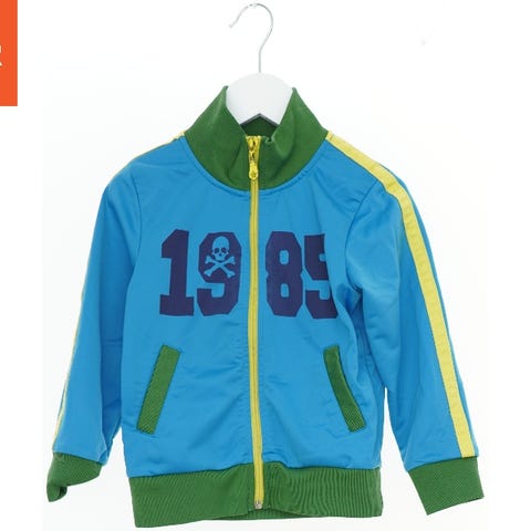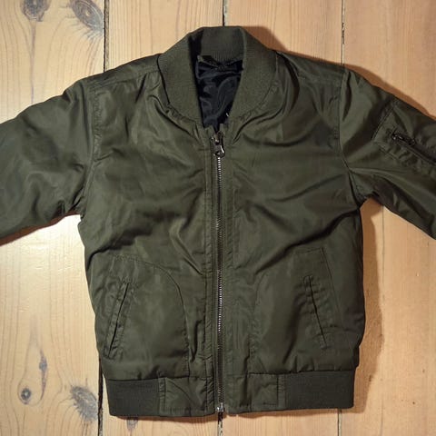 Jakke til børn med hætte og lange ærmer. Jakken er i grøn og creme farver, og har elastik ved taljen og håndleddene. Den har både en forside og bagside, som viser hætten og farvedesignet.