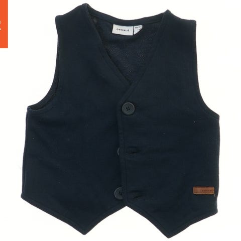 En børnevest uden ærmer med ribkant ved hals og arme. Forsiden har et elgmotiv med brune nuancer. Materialet ser ud til at være strikket stof, og bagsiden er ensfarvet grå. Perfekt til jul.