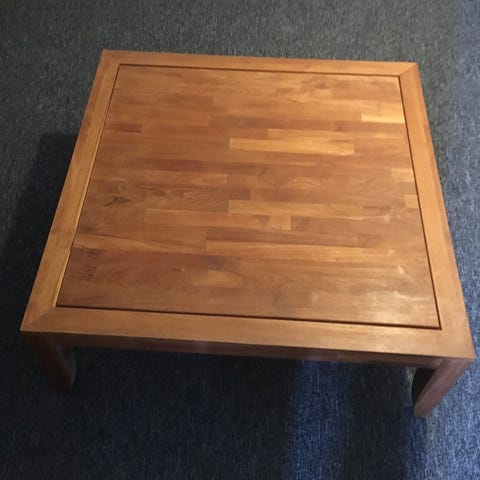 Shaker-sofabord i teak med fine snedkerdetaljer. Stellet er massiv teaktræ