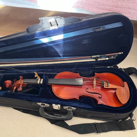 Skoleviolin med bue, skulderstøtte og etui. Størrelse 1/4. Et polstret hardcase-etui med plads til violin og bue. Violinen har lys træfinish og mørk fingerbræt. Frøen (den lyserøde) på buen kan fjernes.