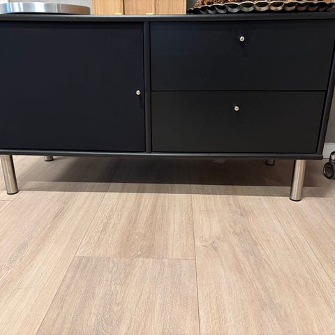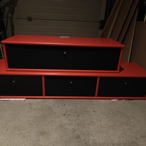 Kan hænges på væggen, men beslag til væggen følger ikke med. Øverste låge er i stof