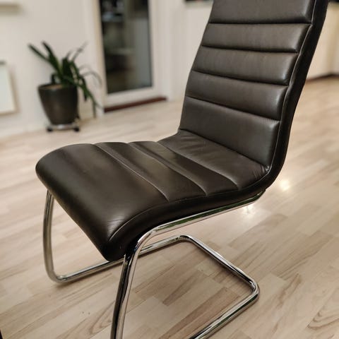 Super siddekomfort, klassisk look. Peteoleumsfarvet kunstlæder og sortlakerede metalben.
