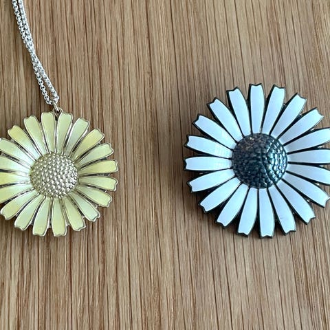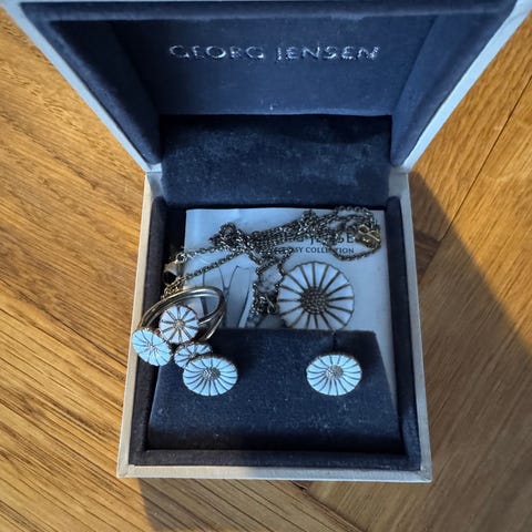 Broche og ørestikker, sølv, Georg Jensen, Marguerite-design i sølv og sort emalje. Sælges samlet. Der er et meget lille afslag i emalje på et blad på broche, som ikke kan ses. Der er taget højde for det i prisen.