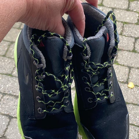Jeg har brugt den til 2 gåture. Derfor brugt to gange, men intet slid af dette og fremstår NÆSTEN som nye. Farverne er mørkegrå, Sort, muldvarp, lysegrå, refleks..