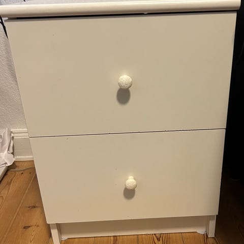 To små sengeborde med lille skuffe. 60 cm høje. Bordplanen er 30 cm i diameter.