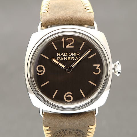 It uses the hand-wound Panerai P.5000 movement, offering an 8-day (192-hour) power reserve. The watch has a sapphire crystal, transparent caseback, brown leather strap, and 100 m water resistance.
