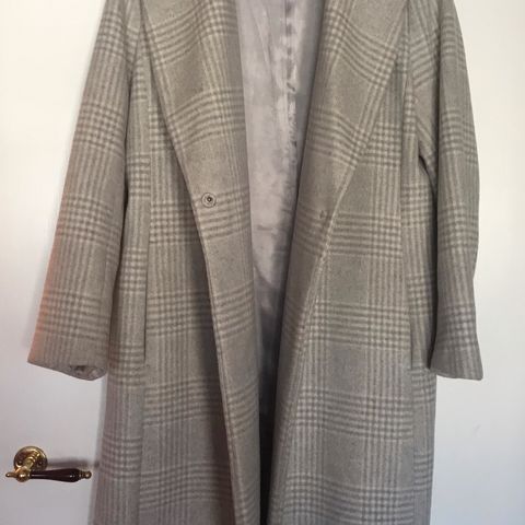 Frakke, str. 34, 55% uld, Frakken er som ny, brugt meget lidt. Med sort foer og sorte knapper, 2 skrålommer, bælte man kan binde. Alm. i størrelse. Sender gerne.