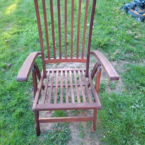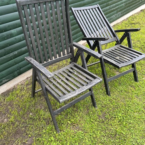 2 havestole i god trækvalitet gives væk. Der er mange år i dem endnu, men de trænger til en rengøring og olie.
