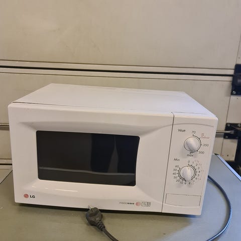 LG mikroovn i hvid. Modellen har frontbetjening med knapper og drejehjul til indstilling af tid, effekt og programmer. Indvendigt ses drejetallerken og rist, hvilket gør den egnet til almindelig opvarmning og tilberedning af mad. Mål: 53 x 31,3 x 46 (inkl. greb). Kan leveres ifølge aftale.