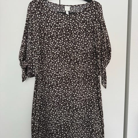 H&M hverdagskjole i viskose i str. 38. Kjolen er blå med små blomsterprint i lyse nuancer. Modellen har rund hals og ærmer med lille bindedetalje. Fremstillet i let vævet viskose, der falder blødt. Velegnet som hverdagskjole til dame.