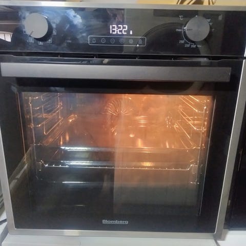 Blomberg indbygningsovn med varmluft i sort design. Ovnen har indvendig belysning, flere riste og bageplader samt ventilator i bagvæggen til jævn varmefordeling. Velegnet som indbygningsovn i køkkenmodul. Front med glaslåge og vandret håndtag for nem åbning og lukning.