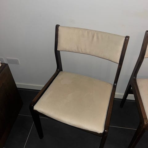 Jeg har selv skiftet stof på sædet og det er ret nemt selv at gøre, hvis man vil ændre stof eller farve. Den ene har lidt slid/nuller på sædet (se billede), men de andre 4 er uden fejl.