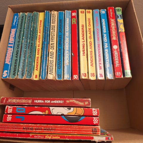 Jumbobog nr 2, 3(2), 4, 6(2), 9, 11, 12(2), 14(4), 16(3), 17(3), 18(5), 19, 21(2), 22(3), 23(2), 24(5), 25(2), 26(3), 27(3), 28(2), 29(3), 30(3), 31(3), 31(2007-udg.)(2), 32(2), 33, 35, 36, 37(3), 39(2), 40(2), 41(3), 43-45, 47(3), 49, 56(2), 57(5), 58(2), 60, 62, 64, 65(4), 66(5 ), 67, 68(3), 69, 70(6), 71, 72(3), 73 (3), 74, 75, 76(2), 77 ( 4), 78 (3), 79(2), 80 (4), 81 (4), 82 ( 2), 83, 84(5), 85 ( 3 ), 86 ( 4), 87(3), 88, 89(2), 90 ( 4), 91 (3), 92( 2 ), 93 ( 4 ), 94 ( 4 ), 95 ( 3 ), 96(3), 97 (4), 98, 100, 104(3), 105(5), 106(4), 108(2), 109 (3), 110 ( 5 ), 111 ( 3 ), 112(4), 113 ( 3 ), 114 ( 3 ), 115 ( 5 ), 116, 117 ( 3 ), 119(2), 120(3), 121 ( 5 ), 122(3), 123(5), 124, 125, 127, 128 ( 2 ), 129 ( 4 ), 130(2), 131 ( 3), 132 ( 2 ), 133 ( 3 ), 134, 135, 136 ( 3 ), 137 ( 3 ), 138, 140(2), 141(3), 142( 3), 143(5), 144 ( 3 ), 145 ( 4), 146, 147 (3), 148(3), 149(2), 150(5), 153(3), 154, 155, 156 (3), 158, 159(5), 161, 163(4), 164(3), 166, 167(2), 168, 169(3), 171(2), 173, 174(3), 175, 176(3), 177, 178, 180, 181(3), 182(2), 183(3), 184, 186, 187, 189, 190(3), 192(2), 193, 197(4), 199(5), 202(2), 203, 204, 205(5), 206(2), 207(2), 209(2), 210, 211, 212 (3), 213(4), 214(2), 215 (3), 216(3), 218(2), 219, 220(3), 221(2), 222(2), 223, 225(2), 228, 229(2), 230, 232, 233(3), 236, 238, 242)2), 243(3), 244(2), 247, 248, 249(3), 250(2), 251(2), 252(2), 253, 254(2), 255(3), 258(2), 260(2), 262, 263, 264(2), 265(2), 266(3), 267(3), 270(2), 271(2), 272, 275(3), 277(3), 279(2), 280(2), 281(2), 283, 285, 287(2), 288(2), 289, 291, 293(4), 294(2), 296(2), 297, 298(2), 300, 303, 304, 306(2), 307(3), 308, 309(3), 314, 315, 316(2), 318(2), 319(2), 320, 322-324, 325(2), 327(2), 329, 330, 332(2), 333, 336(5), 337, 338, 340-344, 346, 348(3), 350, (2), 351(2), 352, 354, 356(2), 357, 358(3), 362(2), 363(2), 368, 369, 371, 373, 374(2), 375, 376, 378, 382, 383, 387, 388(2), 391(2), 392(2), 393, 394, 407-410, 411(3), 412, 414, 417, 427(2), 431, 441, 442(2), 444, 457, 458, 460, 514, 531, Donald Pocket nr 362