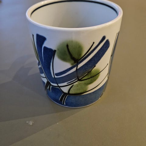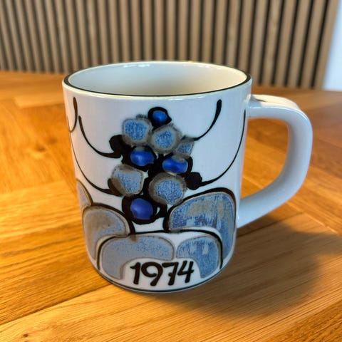 Porcelænskrus med trykte årstal og grafiske mønstre i blå, hvid, gul og grønne nuancer. Krusene har hank og er velegnede til varme drikke som kaffe, te eller kakao. Dekorationen består af forskellige abstrakte og geometriske motiver, hvor hvert krus har sit eget design og årstal. Krusene kan bruges i dagligdagen eller som samlerobjekter og dekoration i køkken eller på bordet.