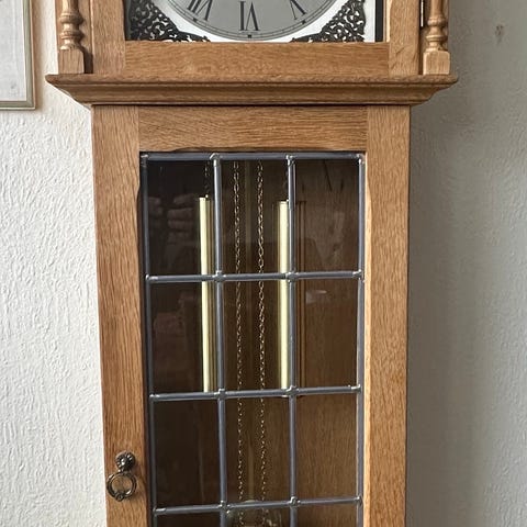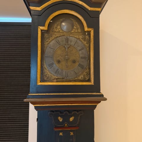 Løwenberg standur i rødtmalet træ. Uret har klassisk urskive med romertal, sekundskala og dekorative messingdetaljer. Mekanisk værk med lodder, som ses bag den nederste låge. Kabinettet er højt og slankt med profileret top og sokkel. Malingen viser brugsspor enkelte steder. Velegnet som gulvur i stue, entré eller lignende rum, hvor der er plads til et højt standur.