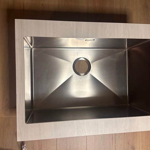 Rustfri stålvask køkkenvask i rektangulær form. Vasken er udført i rustfrit stål med afløb i midten. Egnet til montering i køkkenbord eller bryggersbord, hvor der er behov for en enkelt, dyb vask til opvask eller rengøring. Mål ses på billede med tommestok til reference.