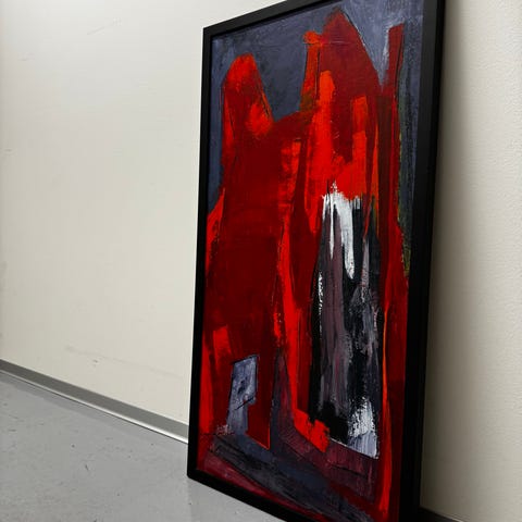 Karin Faaborg maleri abstrakt rød og blå. 1,5x1,5 m