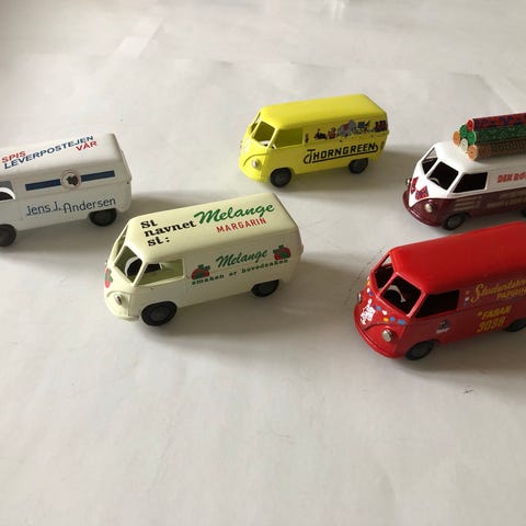 3 VW transportere med dansk tekst (ladvogn m/presenning og påtryk Danske farve-og lakfabrikker/kassevogn (licensvogn med højttalere på tag og påtryk Danmarks Radio TV)/kassevogn med påtryk Tage Schouboe Værktøj.