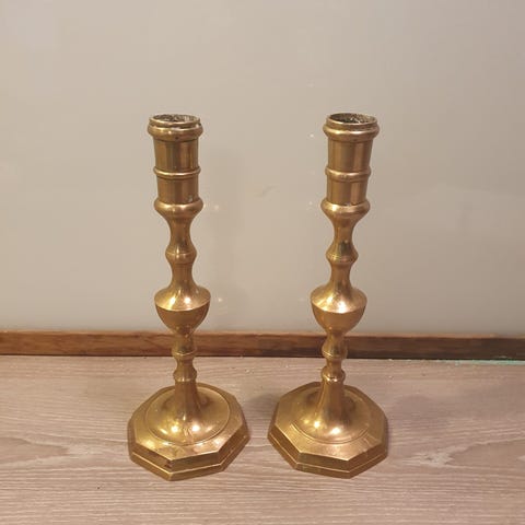 Væghængte lysestager i messing med to arme. Klassisk, ornamenteret design med buede arme og blomsterformede lysholdere. Egnet til almindelige stagelys. Monteres på væg via beslag på bagsiden og kan anvendes som dekorativ belysning i fx stue, gang eller spisestue. Samlet vægt 2,324 g