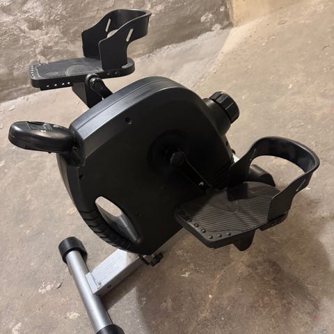 Super god pedaltræner med let indstillelig modstand og rigtig gode faste pedaler med remme der kan spændes fast, så man ikke glider. Display med distance og fart og tid og kalorier, så man kan konkurrere med sig selv og vide, hvor langt man har cyklet. Det øger motivationen.