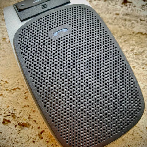 Jabra Bluetooth højtalertelefon til bil. Enheden er beregnet til håndfri telefoni i bilen via Bluetooth-forbindelse til mobiltelefon. Den har indbygget højttaler og mikrofon samt knapper til lydstyrke og opkaldsstyring på fronten. Monteres typisk på solskærmen i bilen og bruges til samtaler under kørsel uden brug af håndholdt telefon.