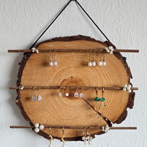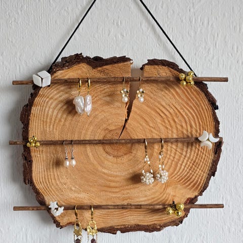 Rustikt, naturligt og pyntet med fine perler. Giv dine smykker en smuk plads på væggen, med et smykkeophæng som fremhæver smykkerne med træets gyldne toner.