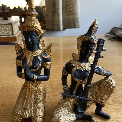 Figurer siddende musikere dekorationsfigurer i bronze med guldfarvet overflade. Sættet består af to figurer i traditionelt inspireret dragt, begge i siddende stilling med musikinstrumenter i hænderne. Overfladen er udført i en kombination af mørk patineret metal og guldtoner, med detaljeret mønster på tøj og hovedbeklædning. Egnet som dekorationsgenstande i hjemmet, f.eks. på hylde, reol eller bord. H. 19 cm B. 15,5. cm. vægt samlet 2,630 kg. PS. se også mine andre annoncer