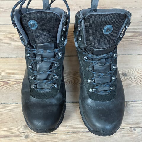 Merrell støvler i størrelse 43. Kraftig ydersål med groft mønster og forstærkninger ved hæl og tå. Snørelukning med flere snørehuller for god tilpasning om foden. Velegnet som vandre- eller fritidsstøvler. Neutrale naturfarver med kontrastdetaljer.