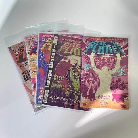 Bitch Planet tegneseriehæfte. Forsiden viser titlen "Bitch Planet" og teksten "Extraordinary Machine" samt forfatternavne DeConnick og De Landro. Omslaget er i lilla og beige nuancer med grafisk motiv. Velegnet til samlere af tegneserier og graphic novels.
