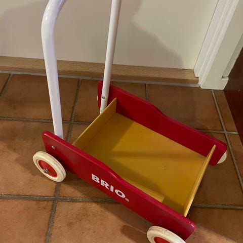 BRIO gåvogn i sort træ med hvidt håndtag og hjul med røde fælge. Gåvognen er velegnet til små børn, der øver sig i at gå, og har plads til at transportere legetøj i vognen. Klassisk design med solid konstruktion i træ og metalhåndtag.