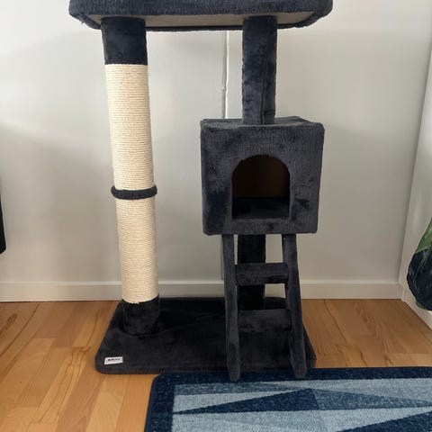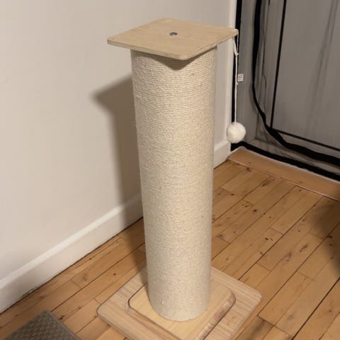 Kradsesøjle med liggeplads i grå farve. Søjlen er beklædt med kradsemateriale hele vejen rundt, så katten kan hvæsse kløer. Øverst er der en polstret, halvrund liggeplads med blød overflade og kant, som giver støtte, når katten hviler. Foden er bred og polstret for stabilitet. Velegnet som kombineret kradsetræ og hvileplads til én eller flere katte.