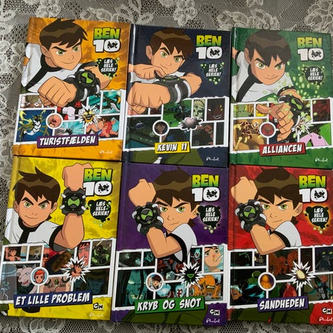 Ben 10 bogserie samling. Sæt med flere bøger i serien med illustrationer fra Ben 10-universet. Hver bog har farverige forsider og bagsider med figurer og korte resuméer af historierne. Velegnet til læsning for børn, der kan lide tegneserier og actionprægede fortællinger baseret på Ben 10-serien.