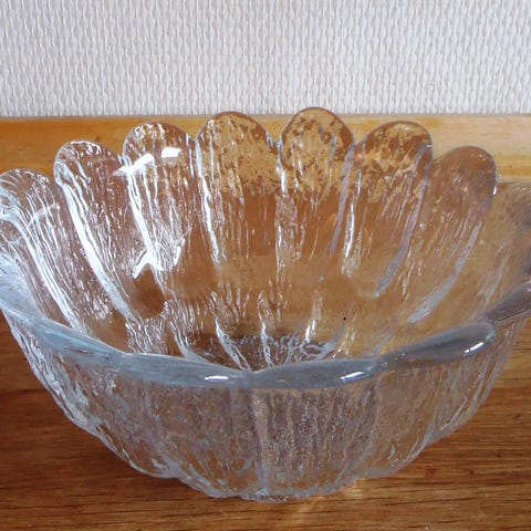 Iittala vintage glas skål med en tekstureret overflade, der minder om bark, Tapio Wirkkala fra 1960'erne. Velegnet til servering eller dekoration