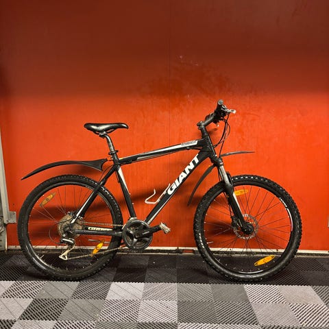 Giant mountainbike til mænd med stelstørrelse M og 26" hjul, lige styr og standard sadel, 24 gear. Farven er hvid med sorte og blå detaljer, cyklen er ikke brugt ret meget, og har stået inde når ikke i brug, kvittering haves