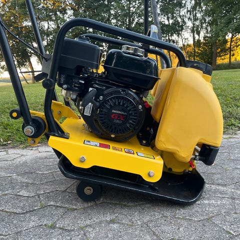 Jordstamper med pladevibrator til komprimering af jord, sand og grus. Maskinen har kraftig motorenhed øverst, fjeder-/bælgsektion i midten og rektangulær bundplade til stampning. Egnet til mindre anlægs- og belægningsopgaver, f.eks. ved fliselægning, stier og mindre fundamenter.