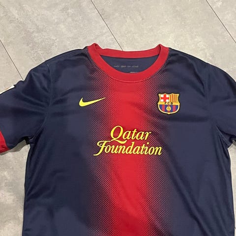 Nike FC Barcelona Puyol fodboldtrøje til herre i størrelse S. Trøjen er i blå og rød med klublogo på brystet, Qatar Foundation sponsortryk foran og Puyol navn og nummer 5 på ryggen. Korte ærmer og rund hals. Egnet til fodbold og fritidsbrug.