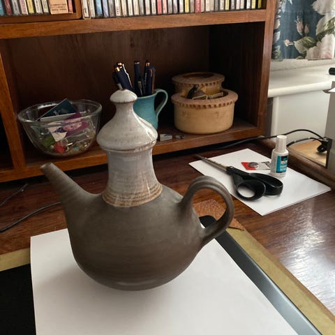 Keramiksæt bestående af tekande med låg og tilhørende flødekande. Begge dele er i beige keramik med grønne dekorationer og sorte hestemotiver langs siderne. Tekanden har hank og tud samt mønstret låg med knop. Flødekanden har lille hank og hældetud. Sættet kan anvendes til servering af te og mælk/fløde ved borddækning.