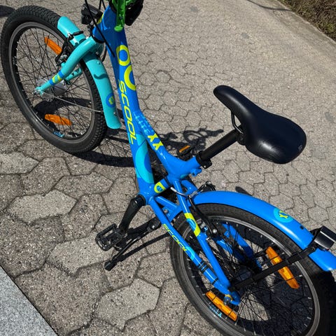 X-Zite Adventure børnecykel med 20" hjul. Cyklen er i blå farve med dekorationer i kontrastfarver. Udstyret med lige styr, saddel med justerbar højde, bagagebærer, 3 gear, basta lås, håndbremse forhjul, fodbremse baghjul, skærme og reflekser på hjul og pedaler. Original kvittering og manual følger med.