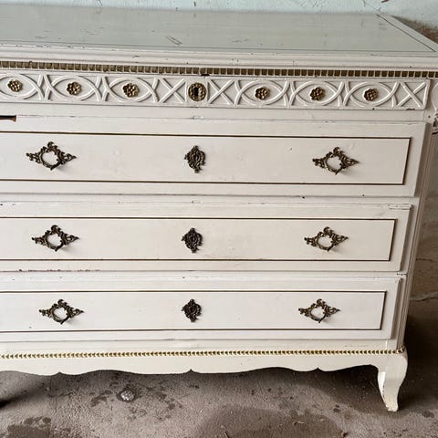 Hvid kommode med fire skuffer. Kommoden har buet front og metalgreb på hver skuffe. Egnet til opbevaring i soveværelse, entre eller stue. Overfladen giver plads til fx lampe, fad eller dekoration.