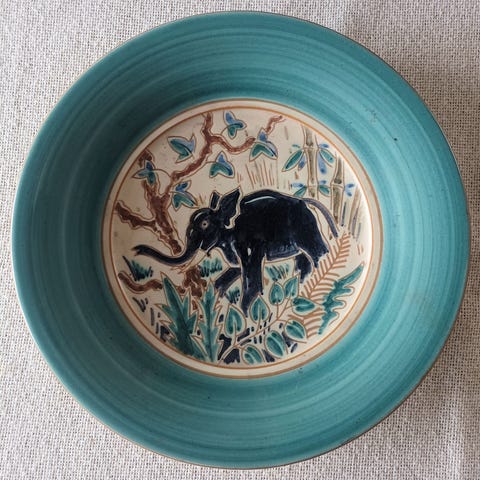 Sjældent stort og meget dekorativt Ejnar Johansen keramikfad med keramikerens personlige initialer/logo og meget flot elefant motiv, so fremstår i perfekt stand med med kun 3 smp chps på kangen som man ikke ser.