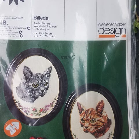 Nogle sider fra det franske kvartalsmagasin Marie Claire Idées efterårs nummer 2003 med broderimønster / tællediagram samt arbejdsgang til et fint billede af en kat broderet med korssting på hørlærred.