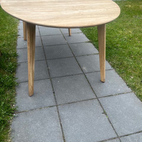 Pænt ovalt spisebord sælges med 2 stk. gratis udtræksplader. Bordet har ingen fejl, hak eller lignende men naturlige svage brugsspor. Bordben kan skrues af.