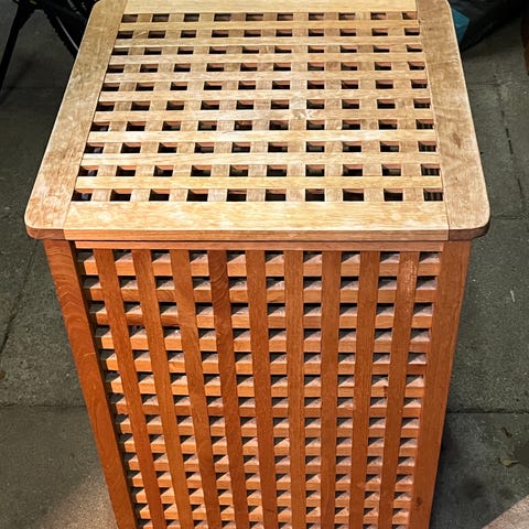 Vasketøjskurv i træ med låg. Kurven er udført i et gitterdesign, der giver ventilation til indholdet. Indvendigt er der en løs indsats/pose til vasketøj. Velegnet til opbevaring af tøj på badeværelse, soveværelse eller bryggers.
