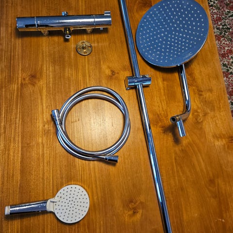 Bruser med rund hovedbruser monteret på loft/nær loft og tilhørende håndbruser på stang. Brusesættet består af en lodret stang med fastmonteret hovedbruser øverst og holder til håndbruser samt blandingsbatteri nederst. Velegnet til montering i bruseniche eller badeværelse, hvor der ønskes både fast hovedbruser og fleksibel håndbruser.