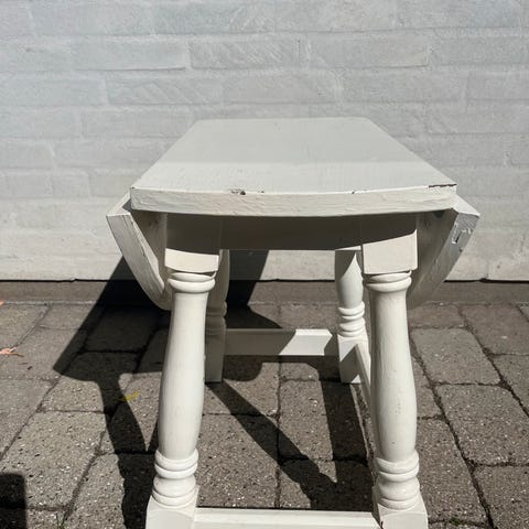 Hjemmelavet af snedker. Har en del mærker fra leg, men er ikke malet. Barnet på billedet er 3 år. Kan bruges både i legekøkken og til at spise med de små.
