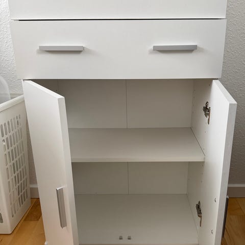 Lille kommode med tre skuffer. Sider i sort og hvide skuffer.