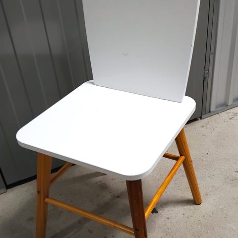 En gammel potte stol opfrisket med maling, brugt til siddestol og til bamsen/dukken, putte ting gennem hullet og se det nedenunder hullet 😊