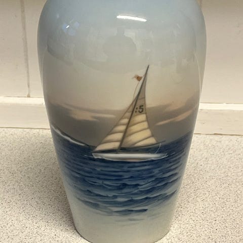 Nummeret vase med skoleskibet Danmark og Kronborg om styrbord . Hel ingen skår . Højde ca 25cm