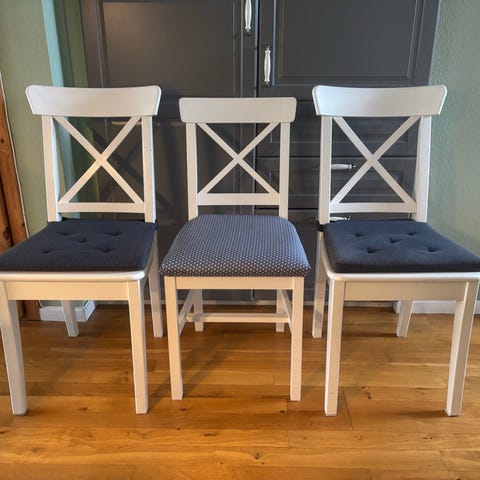 Spisestuestol i hvidmalet træ. Stolen har krydslamelryg og firkantet sæde. Velegnet til brug ved spisebord eller som ekstra stol i køkken eller stue. Der er 12 stole og de er fra IKEA og mærket Ingolf - koster kr. 400 fra ny, sælges til 100,- stykket