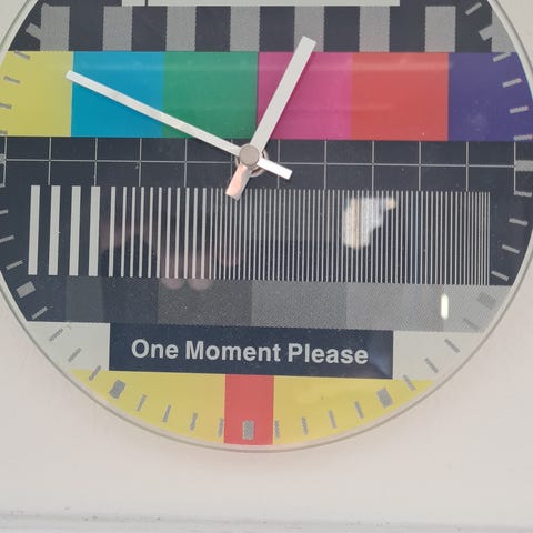 Rundt vægur med motiv inspireret af klassisk tv-testbillede og teksten "One Moment Please". Uret har flerfarvet skive med tydelige markeringer og én viser. Egnet som dekorativt ur til ophæng på væg i fx stue, kontor eller værelse.